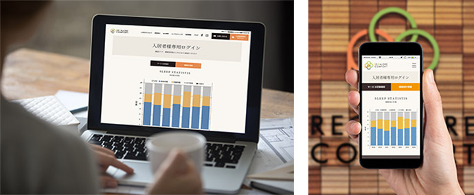 施設で行われた介護情報・身体情報・睡眠情報をログインすることによってご確認いただけます。
